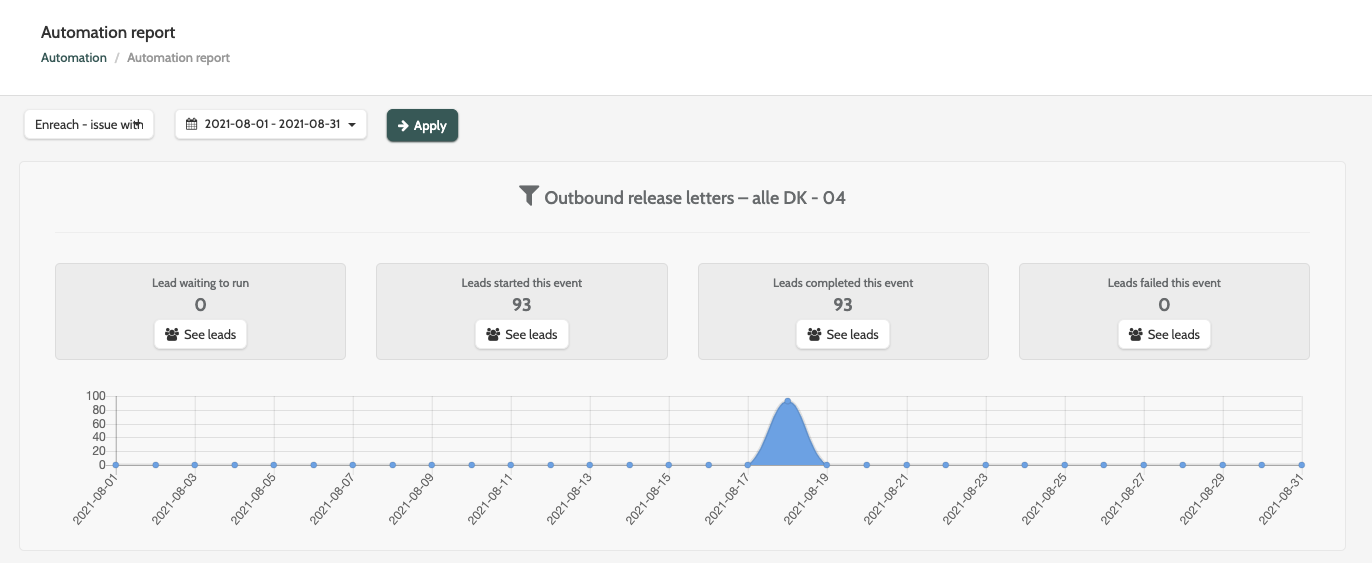 Click Report to be taken to automation reports. View a complete breakdown of how your automation is performing, and track leads as they move through different automation events.