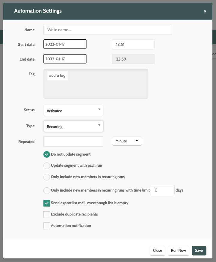 When you are done, click Save to save the automation, Run Now to activate the automation, or Close to exit without saving.