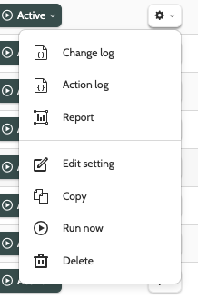 Click the cog and choose between Change log, Action log, Report, Edit aetting, Copy, Run now and Delete.