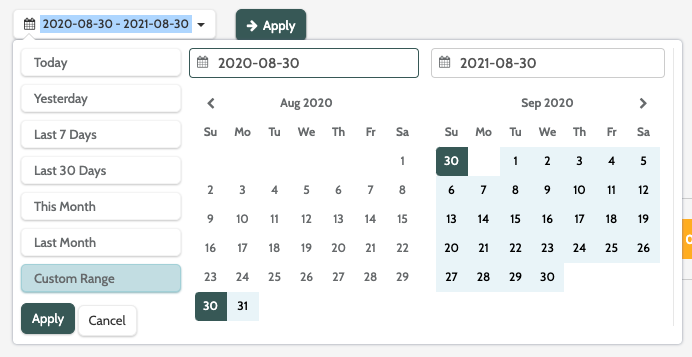• Date: use the date picker to choose either a custom or preconfigured date range for your report