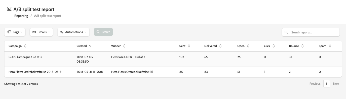 A/B split reports will allow you to generate reports on any email split testing carried out, and view detailed statistics of how each email performed.