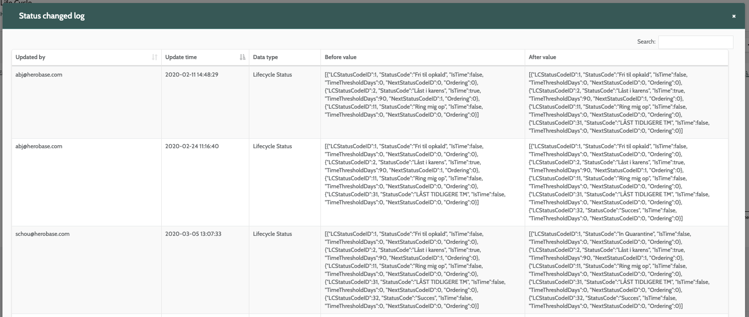 In the Status changed log you can view all historical changes made to that lifecycle, including who it was updated by, and the changes that were made.