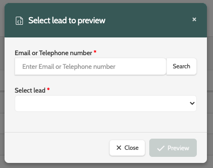 To preview your PDF contract with lead information, first enter the email address or telephone number of the lead, and click Search.