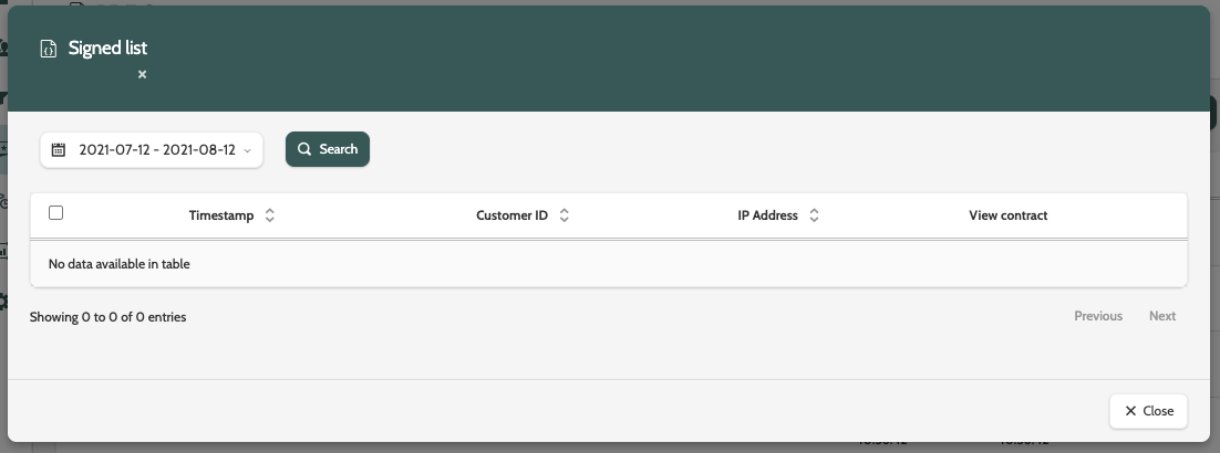Signed list will display details of all leads who signed the PDF contract within a certain timeframe, including the Timestamp, Customer ID, and IP Address.