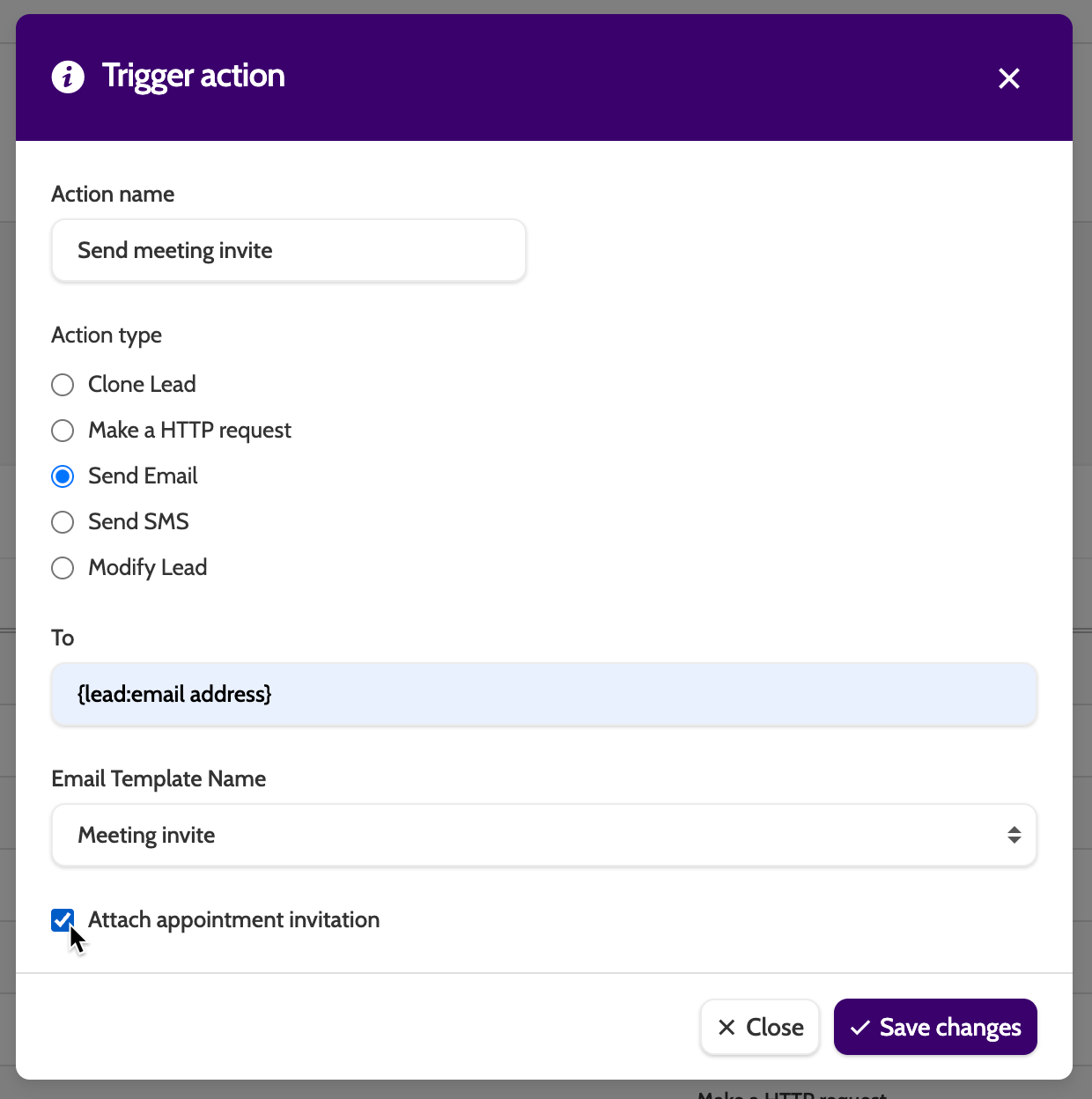 Simply check the Attach appointment invitation checkbox when creating an email trigger, and enter the email address mergefield in the To field: