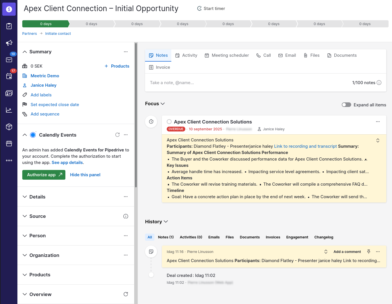 Meeting participants are then matched to Pipedrive contacts, and a note about the meeting is created.