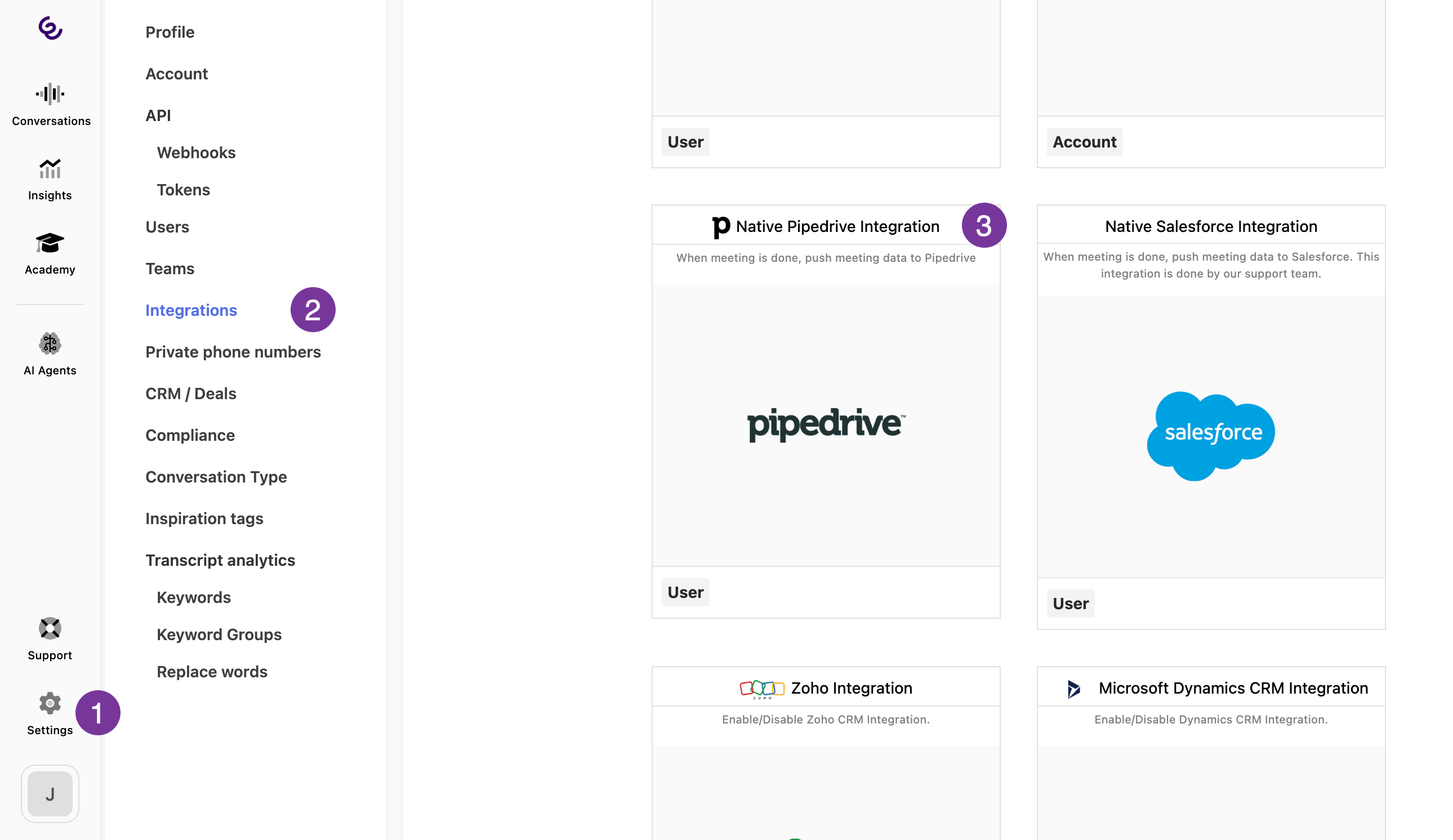 - In Smart Talk Insights, go to Settings â Integrations â Pipedrive.