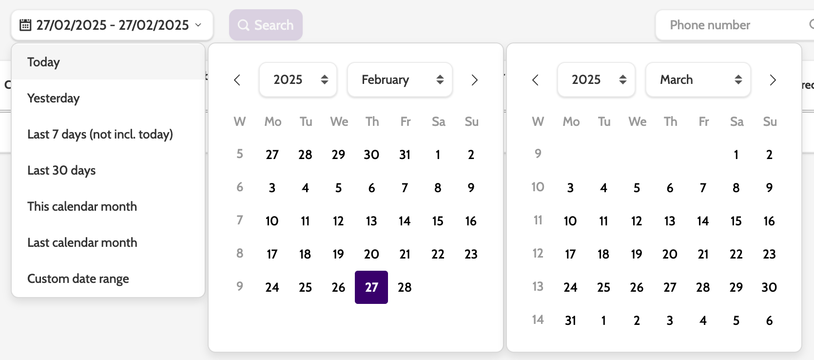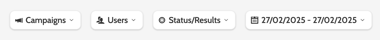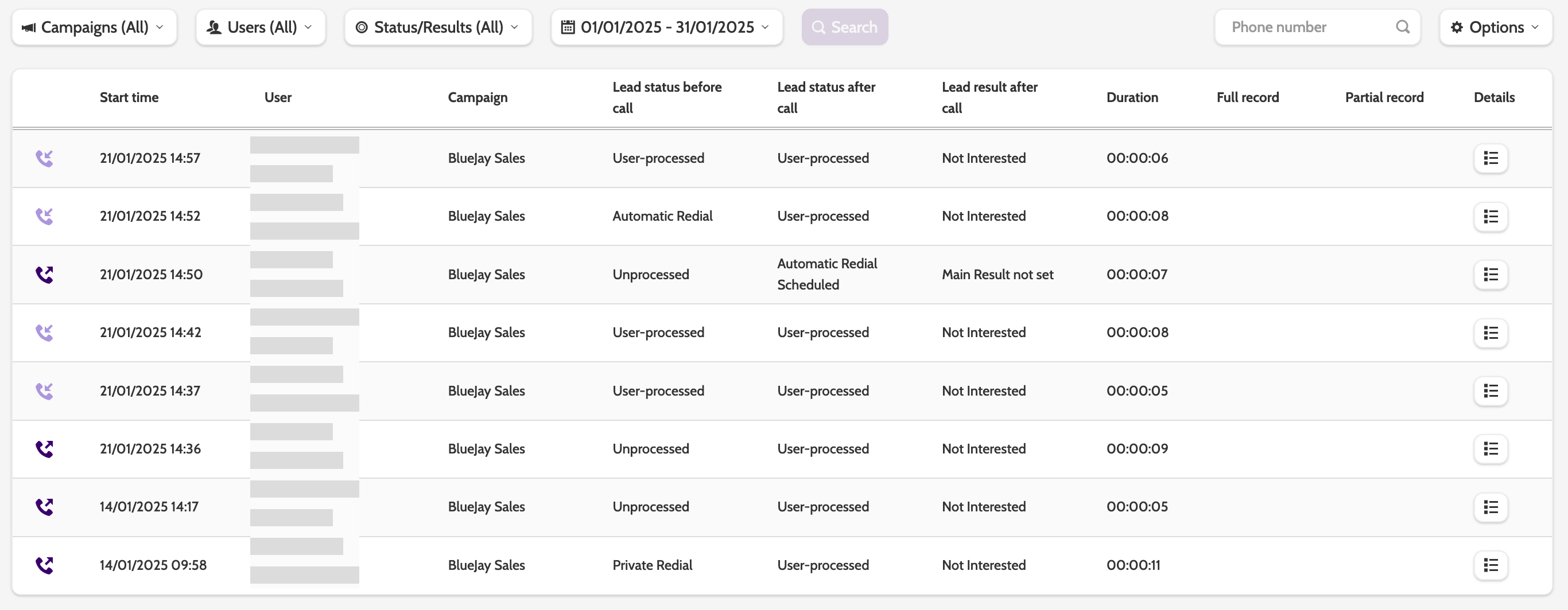 You can also use the top menu to filter calls based on Campaigns, Users, Status and Results, and Date range.