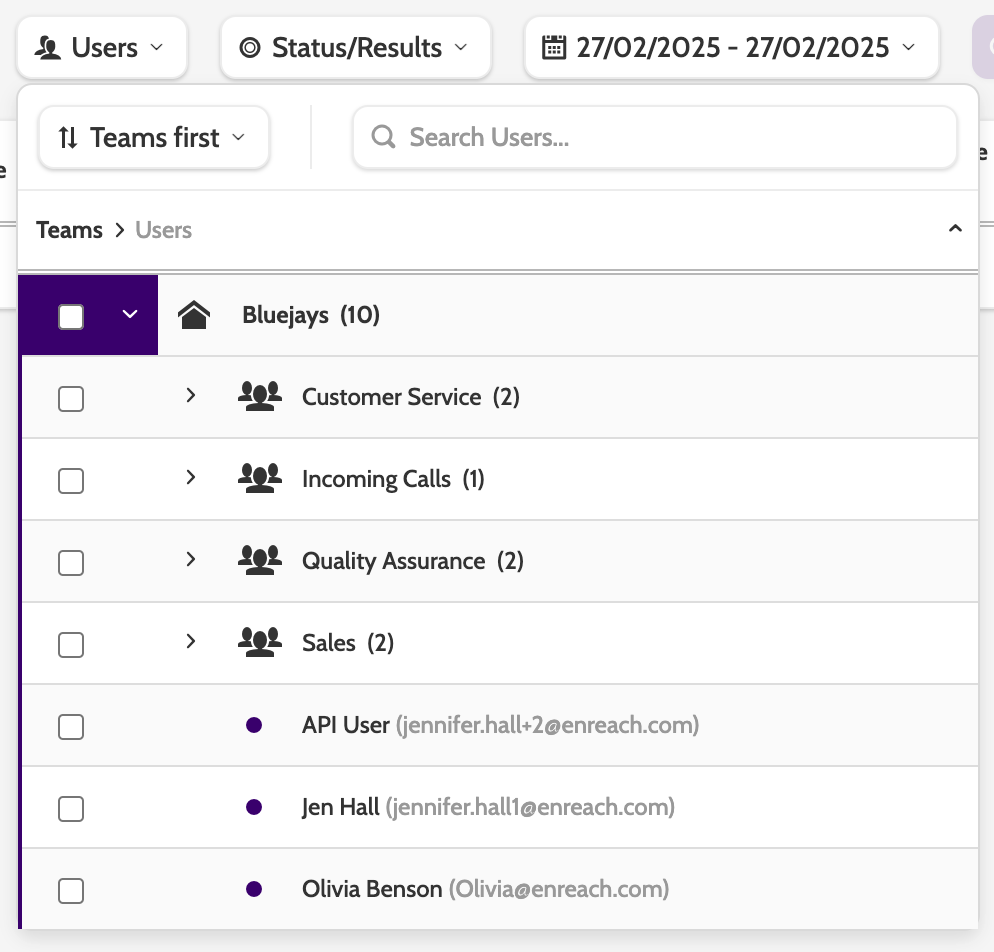 Expand the Users menu to filter search by calls placed by certain teams or users.