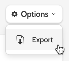 To export the search result data as a CSV file, expand the Options drop-down menu and select Export.