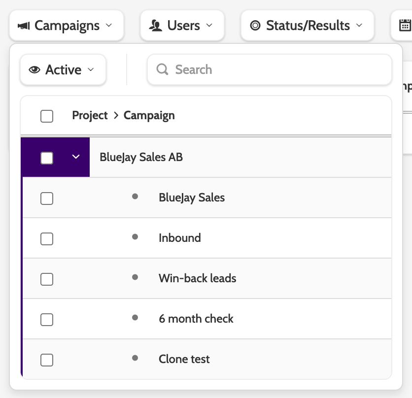 Expand the Campaigns menu to filter the search by projects or campaigns.