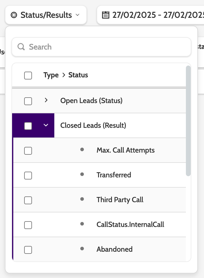 Expand the Status/Results menu to filter the search by Call Status or Call Result.
