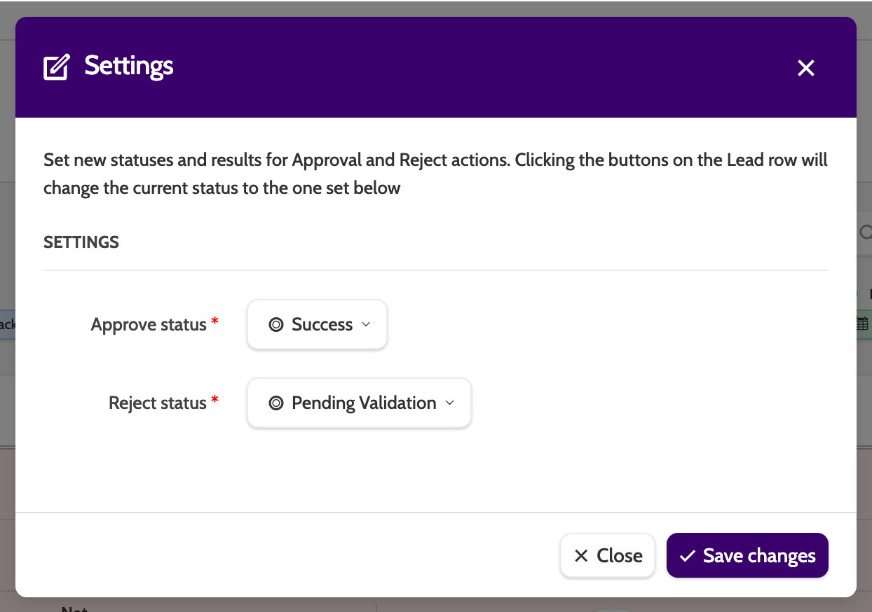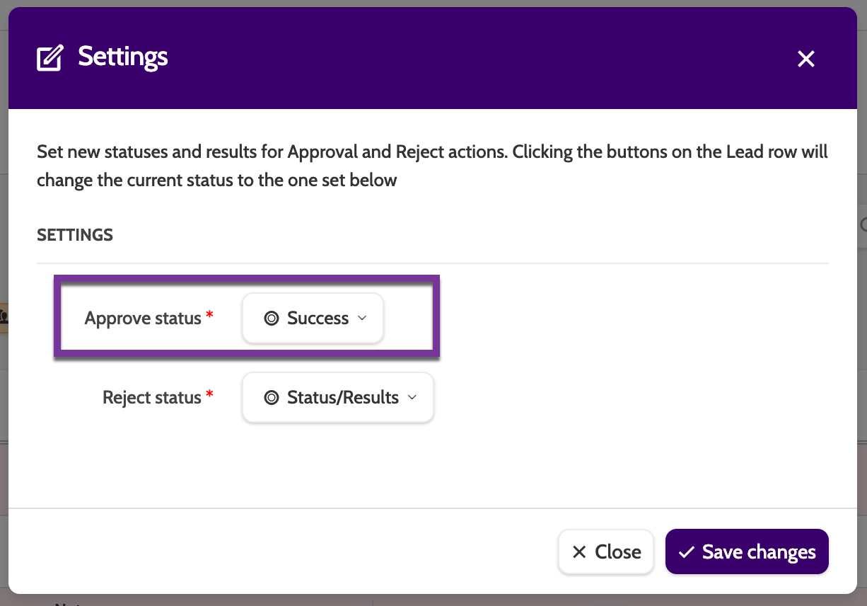 In Settings, configure which Status or Result the Lead will be given once they have been approved or rejected.