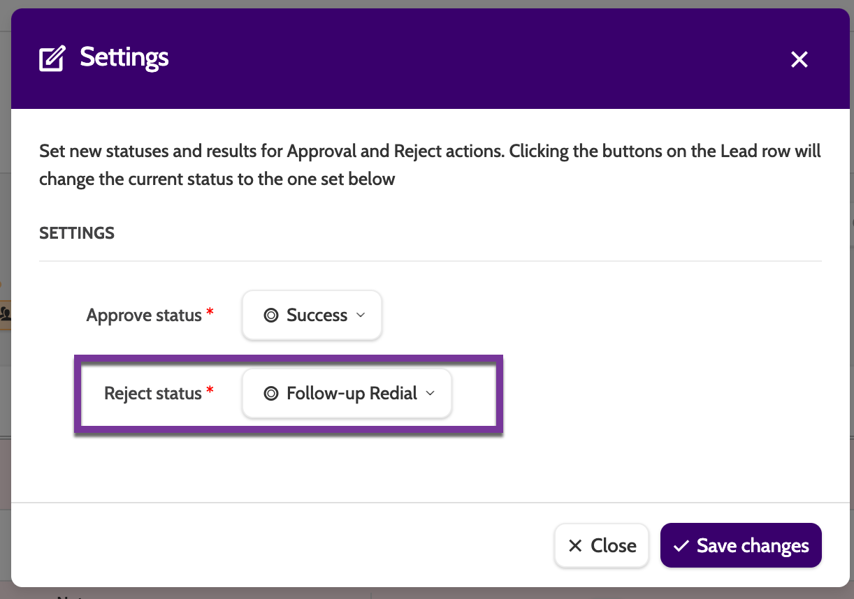 If the lead does not pass the quality assurance process, clicking Reject will change the status to what was configured in Settings > Reject Status.