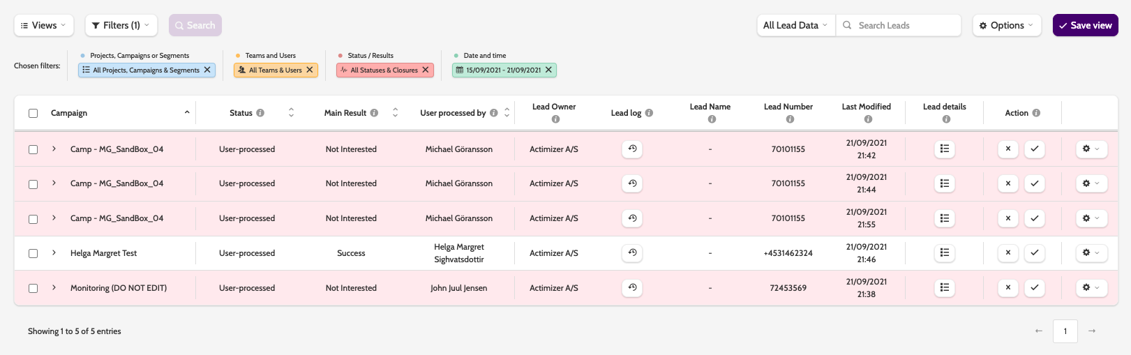 In the navigation you can view all leads that have been sent to Quality Assurance, including the campaign they came from, the status, and the main result