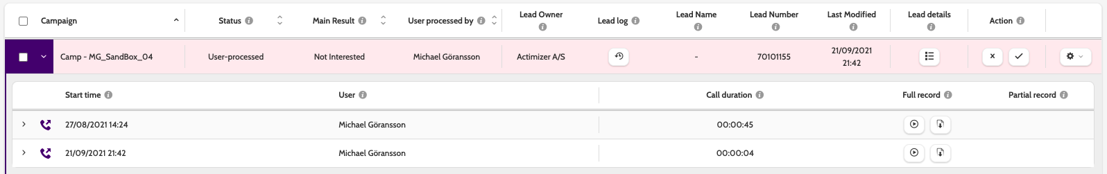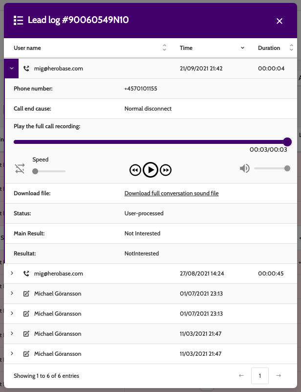 Open the Lead log and expand an entry to view the call or edit details. Here you can listen to the call, download the sound file, and view all the call statistics.