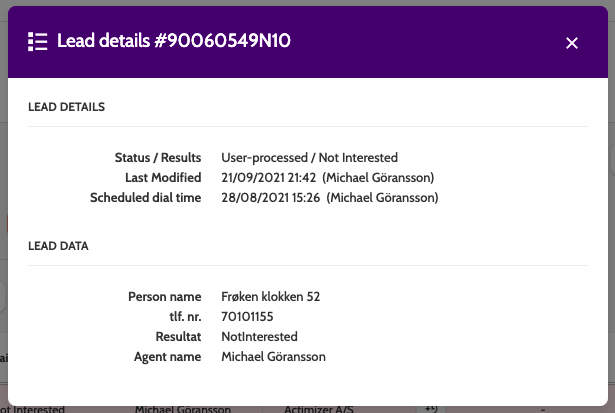 Click the menu under Lead details to open the lead details and data for the call.