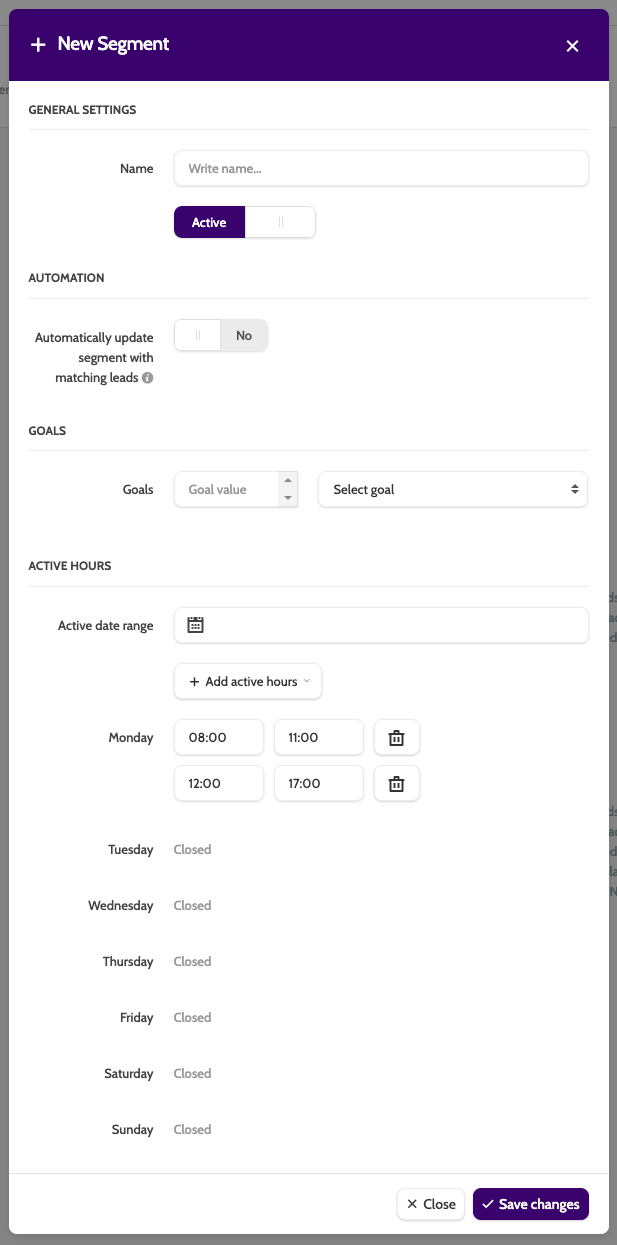 - Active Date Range: click the calendar icon to manually set a start and end date for the segment. You can also set active times according to weekday, and control when the segment can be called. Click Add active hours to set multiple active times for the same day.