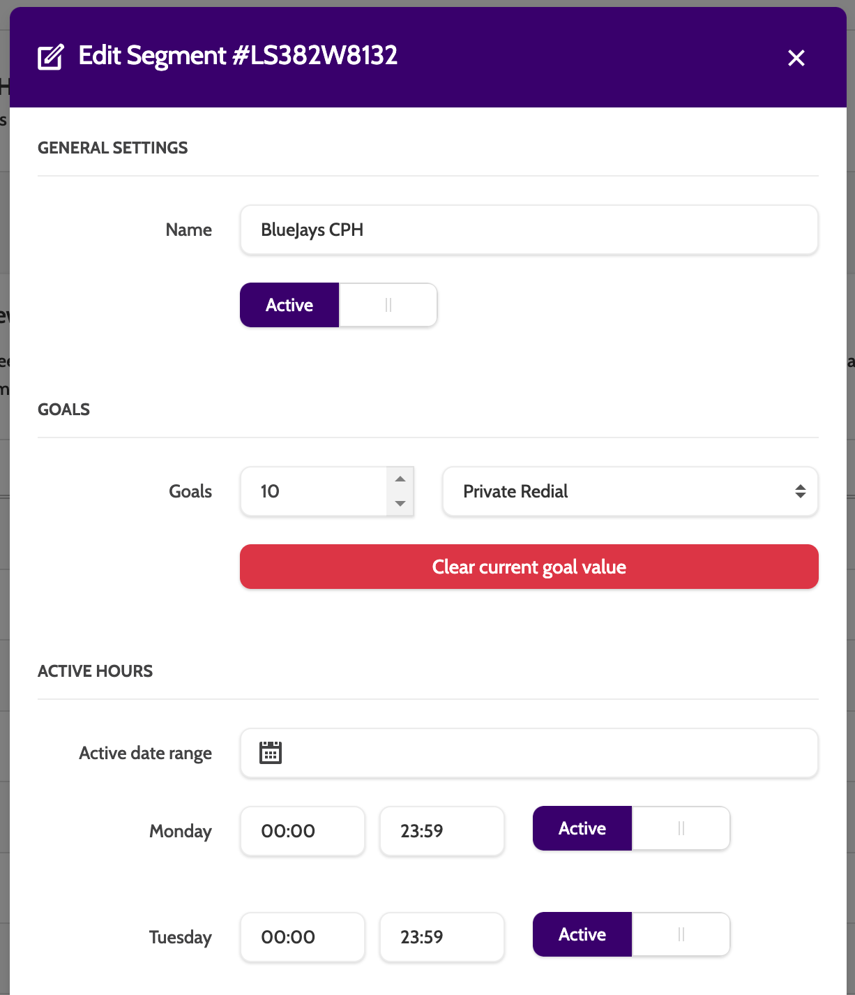 Click Edit Segment to adjust the general settings, goals, and opening hours.