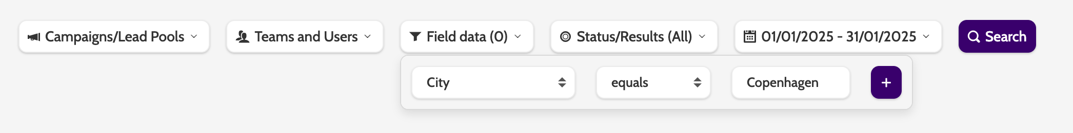 - Field Data: choose which campaign data fields the segment should filter by. In the image below, the City data field has been chosen, the condition has been set to equals, and the result is Copenhagen. This means that the Segment will filter all leads in the chosen campaigns and lead pools that have Copenhagen in their City data field
