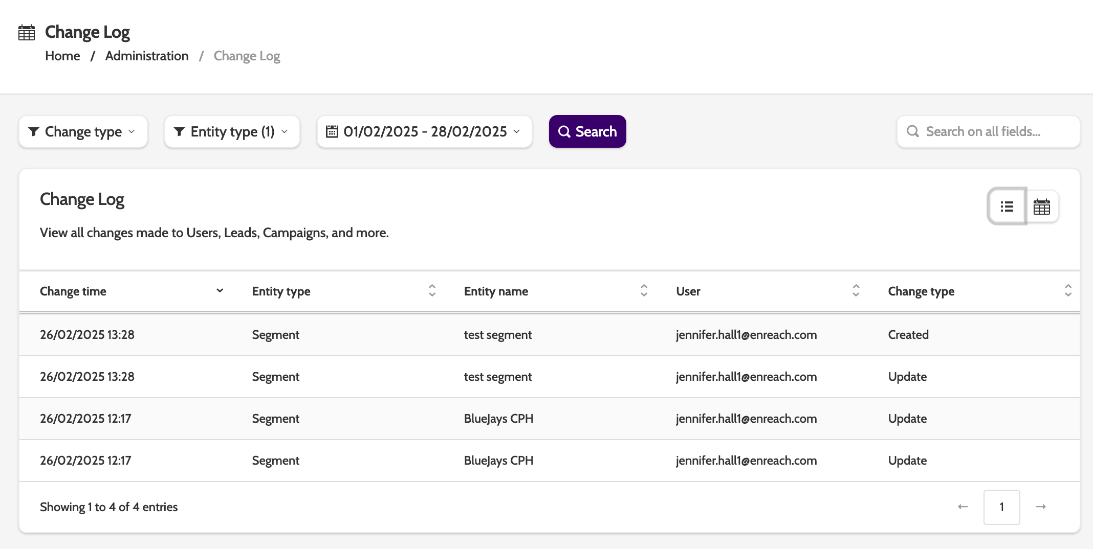 To view a complete list of edits made to the segment, click Show Log to view the segment change log.