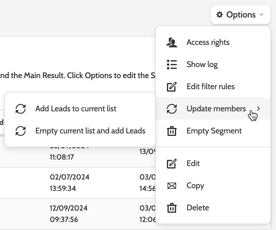 - Empty current list and add Leads will remove existing leads in the segment, and add the news ones found with the Filter Rules.