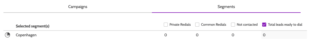In this image below, the agent has chosen to select segments on the campaign selection page, and call leads in the Copenhagen segment. When dialling, the agent will only be connected to leads in the Copenhagen segment.