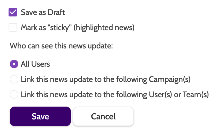 Enter any tags, separated by a semicolon (;), that will be used to filter your news posts. For example, it's a good idea to tag posts according to what campaign they refer to.