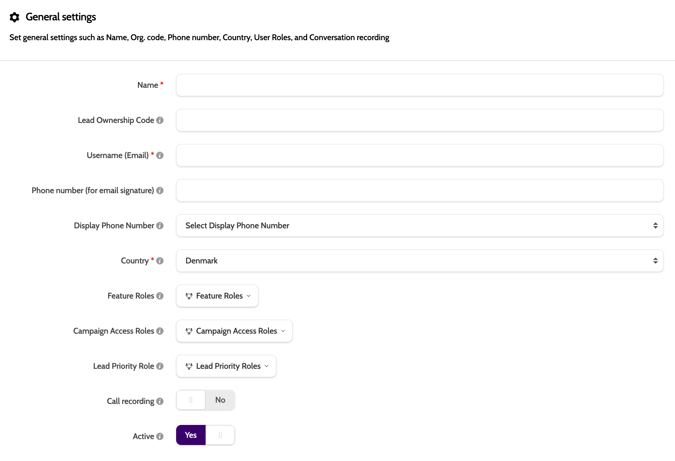 - Lead Ownership Code: create a unique code or word that will connect the user to a specific group of leads with the same code or word. If you have uploaded leads with a lead ownership code, enter the relevant code here. If this field is left empty, the lead ownership code will automatically be the user's email address