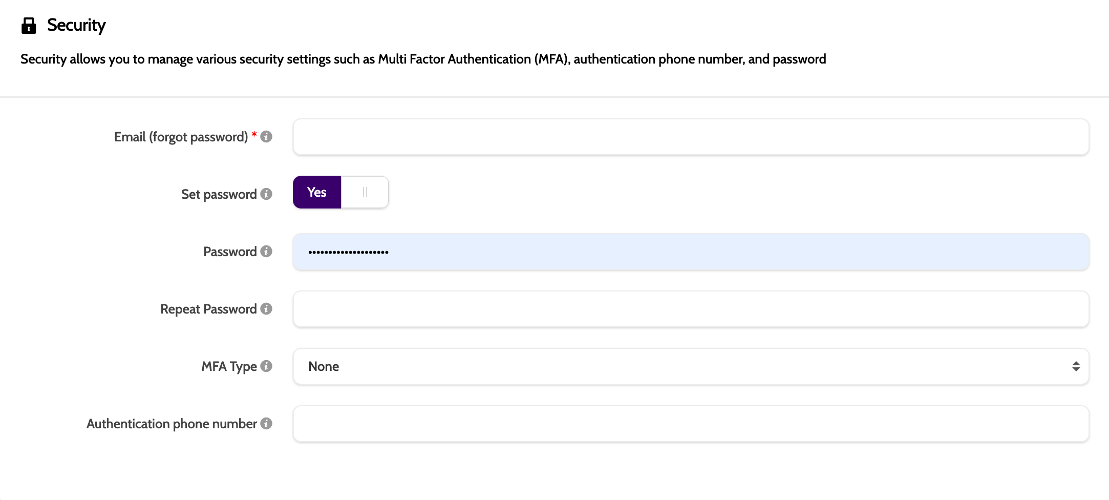 - Authentication phone number: if MFA is enabled via SMS, authentication codes will be sent to this phone number.