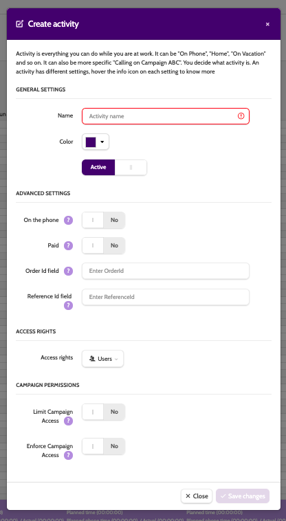 - Access Rights: define which users have access to this activity in their work schedule