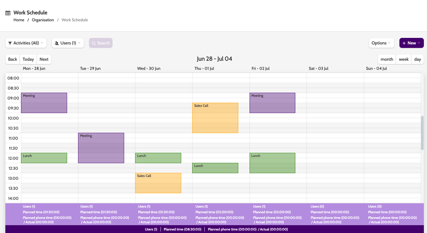 Work schedule is a calendar which displays activities planned for users in your organisation.