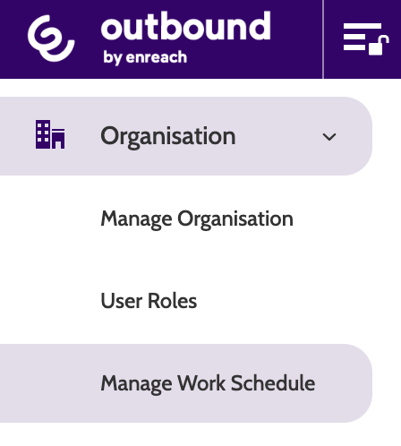 Manage Work Schedule can be found under the Organisation menu.