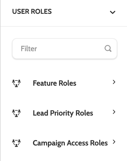 Hover over Feature Roles, Lead Priority Roles, and Campaign Access Roles to select which kind of user role you want to create.