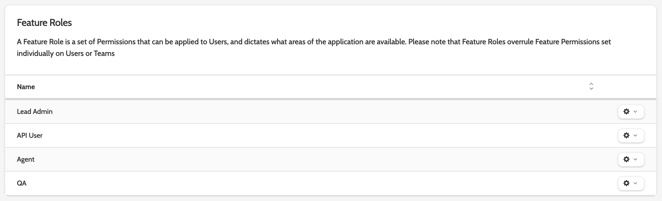Click the cog to configure which teams or users have access rights to the feature role, view a history of changes in Change Log, or Edit, Copy, or Delete the feature role.