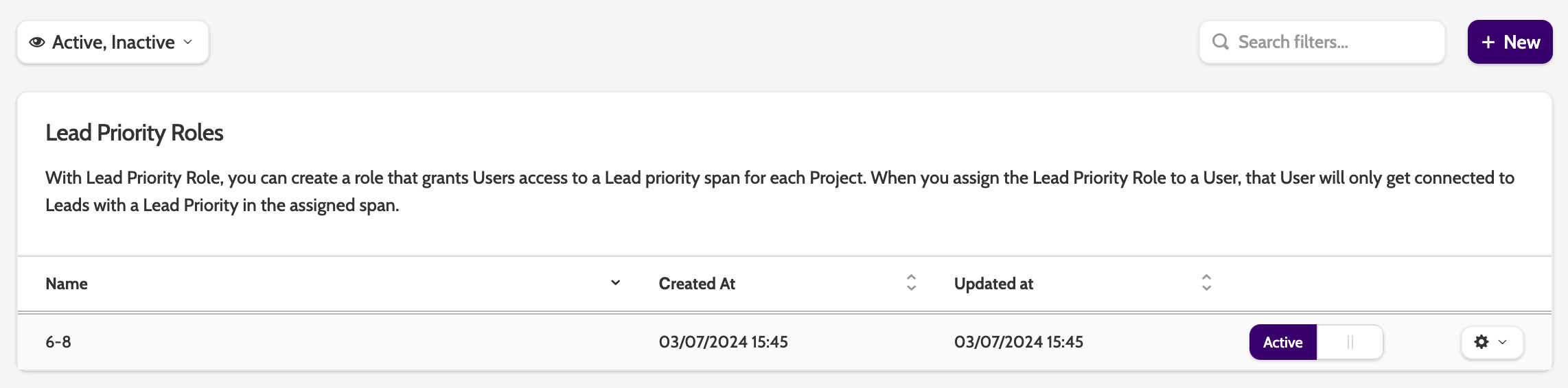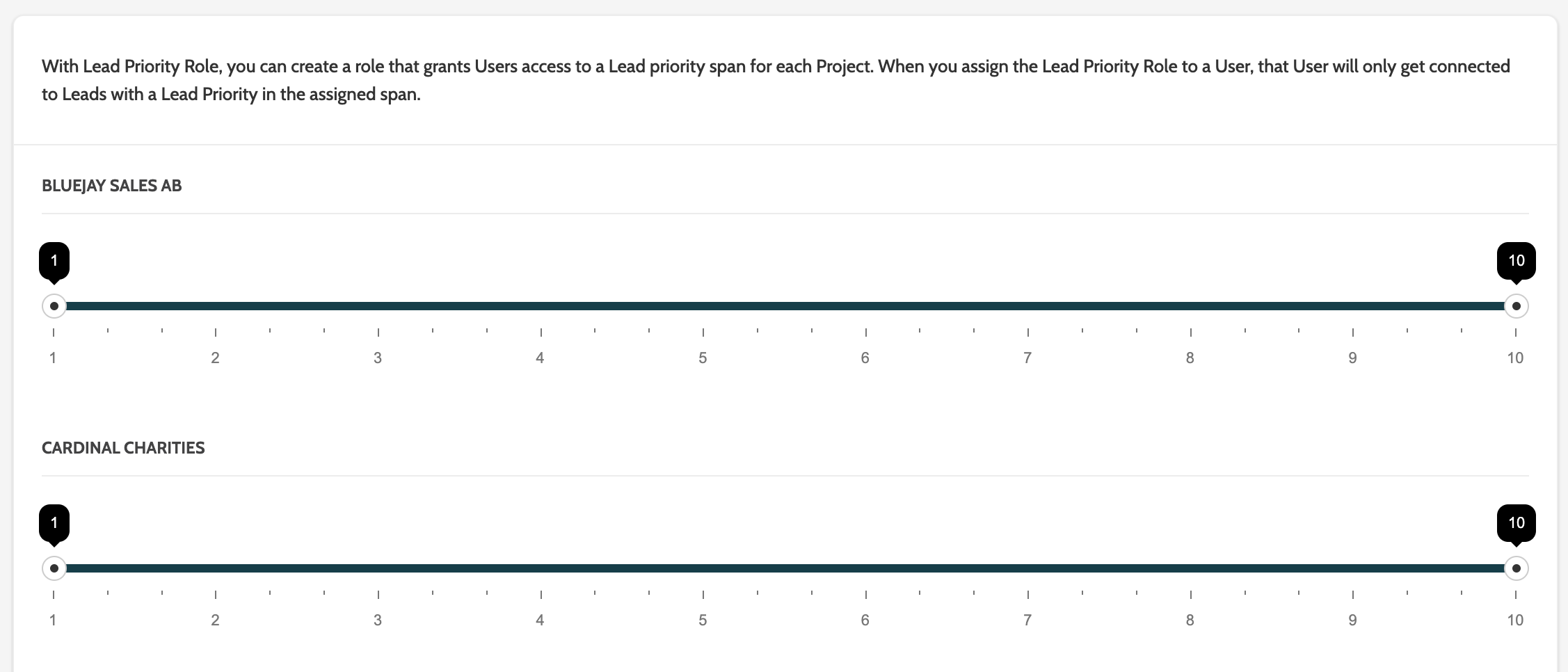 With Lead priority roles, you can create a role that grants users access to a lead priority span for each project. When you assign the lead priority role to a user, that user will only get connected to leads with a lead priority in the assigned span.