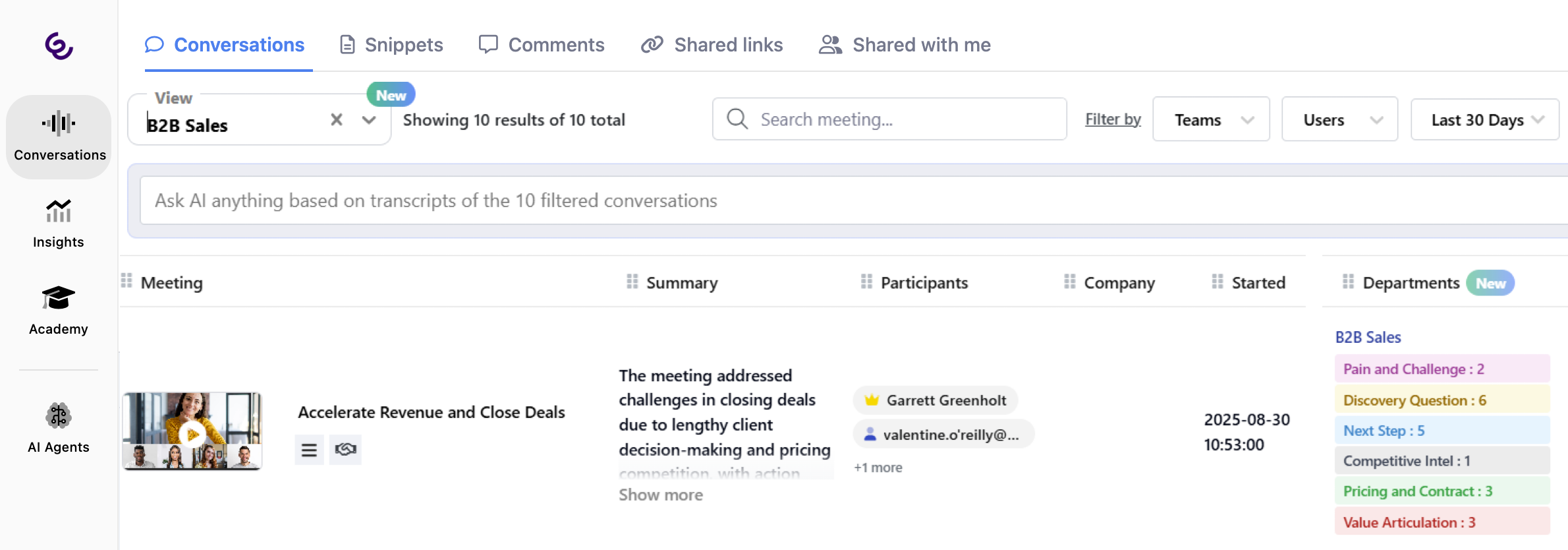 As with phone calls and online meetings, live meetings are stored as conversations, and can be transcribed, summarised, and analysed with AI.