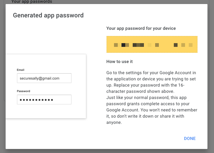 Gmail will generate a secure password for you to input to your SMTP settings in the Administration page.