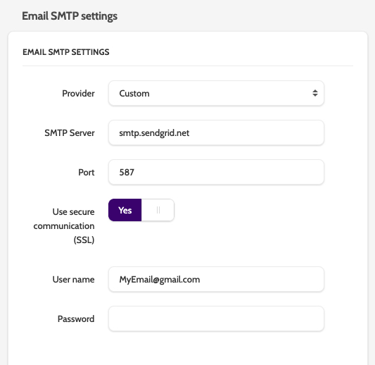 Under Email SMTP settings in Administration, select Custom as your Provider, enter your Gmail address in the User name field, and enter the App password in the Password field.