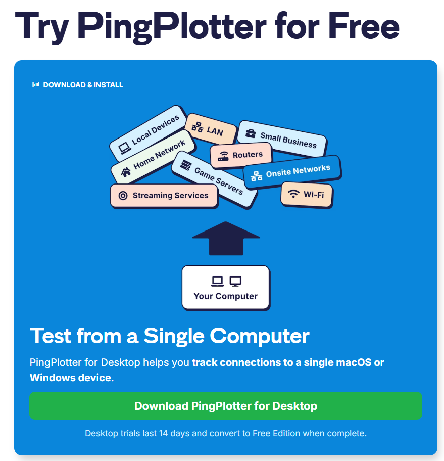 Additionally, PingPlotter only collects ping and trace route data (including IP address/DNS name of the destination and intermediate hops), and the Machine Name of the device on which the agent is installed. PingPlotter does not track websites visited, applications used, or sells personal information.